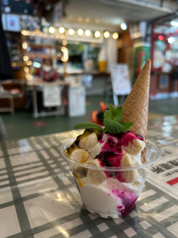 バニラソフトクリームにちんすこうとフルーツソースで味変しながらおいしくいただきますたー!
