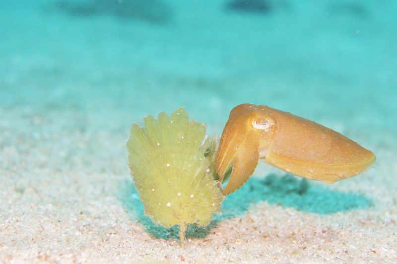 可愛らしいサイズのイカちゃーん!!葉っぱのふりをしているのか、隠れられているつもりなのか、、、??