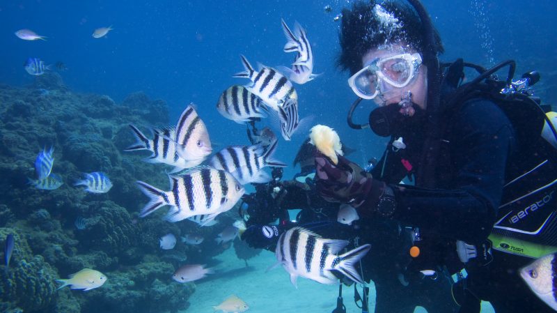 たまには餌付けなんてしちゃったりして魚まみれにー!