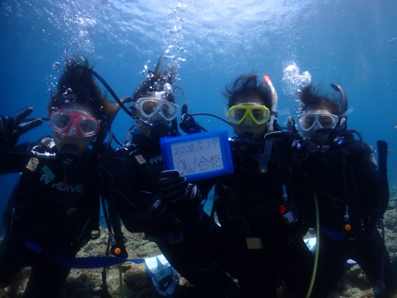 OWの資格を授業で取りに来ました!沖縄の海は世界でも有名場ダイビングスポットであると聞いて、そのような海で学習ができて、とても恵まれているなぁと思いました。合格できたのもヒロさんの分かりやすい指導のおかげです!ありがとうございます♡ものすごくキレイな海の様子をのぞくことができて、感動しました。あっというまに終わる楽しい時間になりました!本当にありがとうございました:)【タケシ】