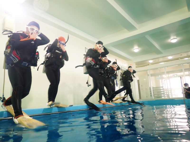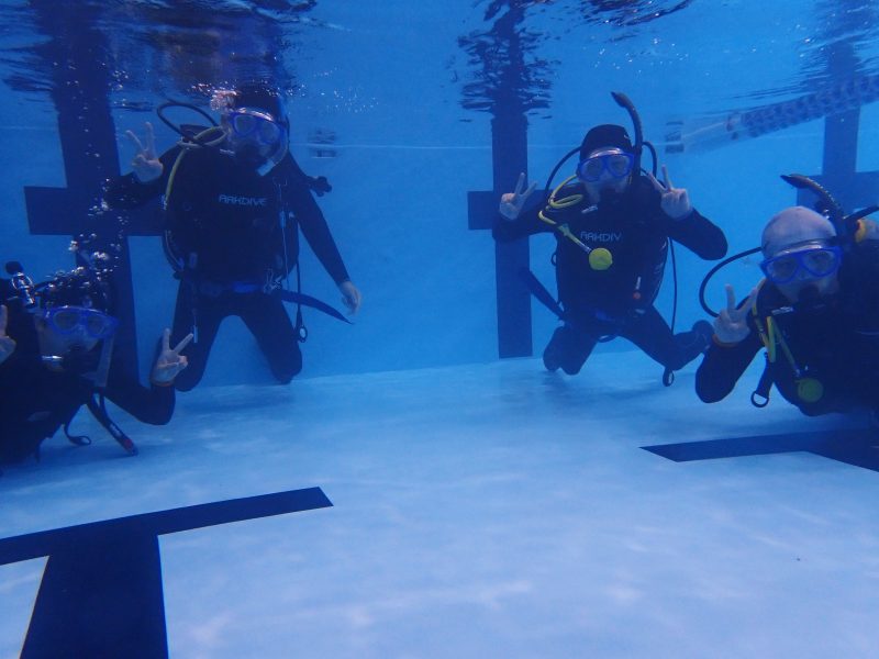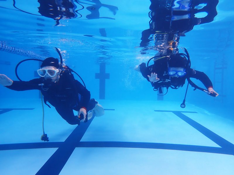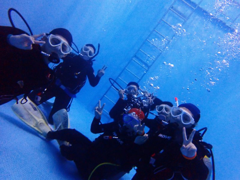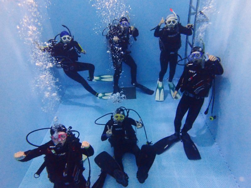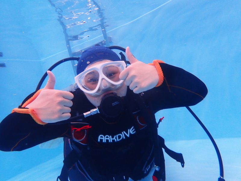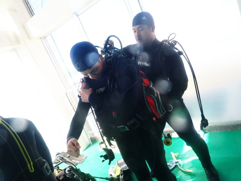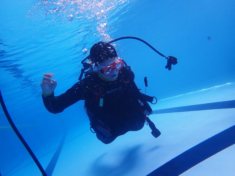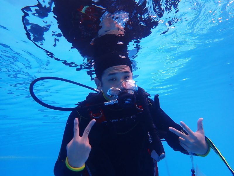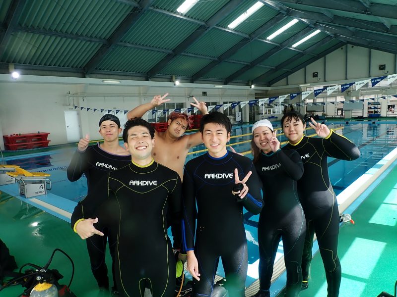 昨日の学科講習で勉強した知識をフル活用して実際の器材を使ってプールで練習練習ー!