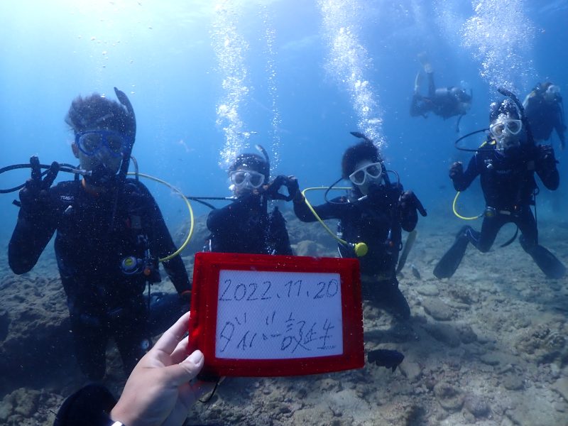 初のダイビングで沈むのが難しく感じましたが楽しく潜ることができました。また最初は5キロだったウエイトが3キロに減ったため成長を感じることができました。スクーバダイビングⅡも受講し苦手だった中性浮力をマスターしたいです誠にありがとうございました。【ゴリ】