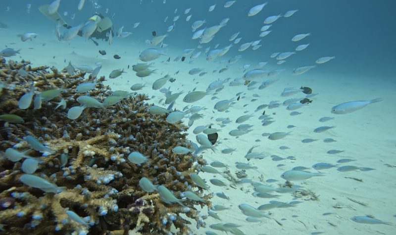 テバスズメダイでしたっけ?群れで珊瑚に一斉に隠れていく動きが好きで近寄って遊んじゃいます(笑)